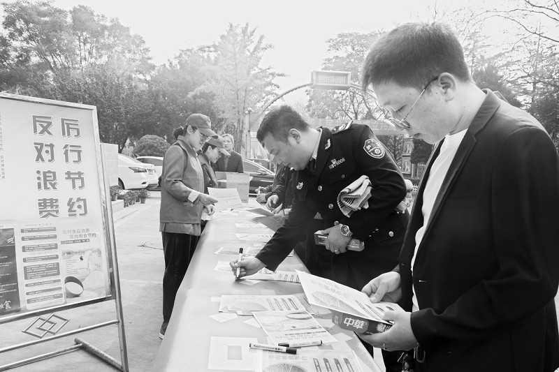活动现场,青年志愿者通过发放宣传材料、张贴宣传海报、主题条幅签字等形式向干部职工普及《中华人民共和国反食品浪费法》及制止餐饮浪费等知识,教育引导大家弘扬勤俭节约的优良传统,共同营造节约用餐、反对浪费的良好氛围。