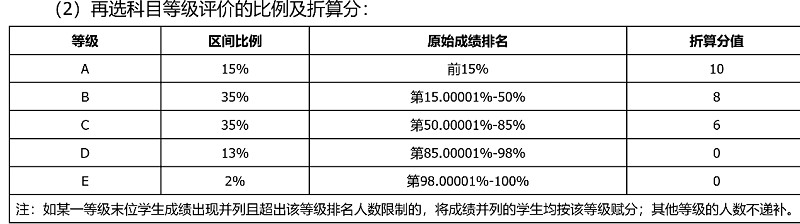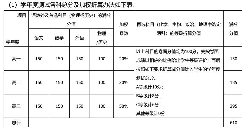 高中学业水平考试(会考)成绩构成:依据学生参与学年度测试选科的情况,将语数外和相关首选及再选科目的会考等级评价结果折合成分值成绩计入总分。其中“A”计5分,“B”计3分,其他等级不计分。会考计分科目总计6科,满分30分。