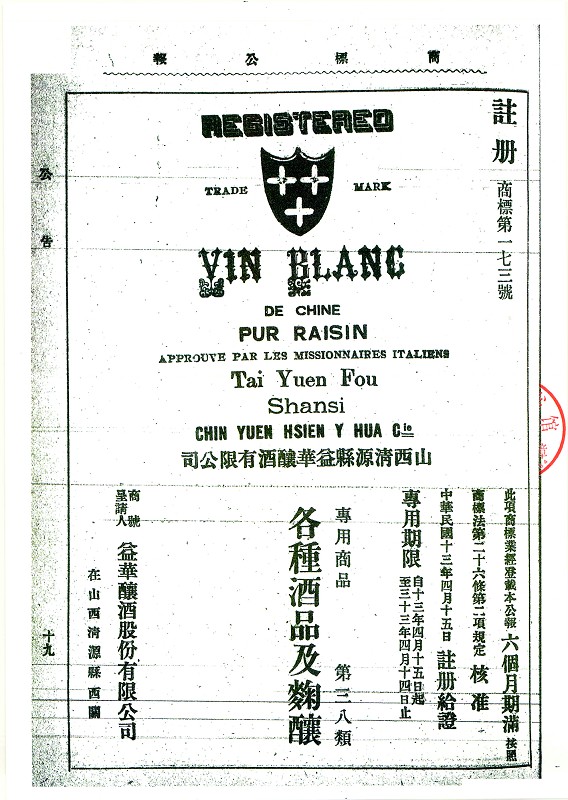 经过查阅核实,益华公司是1923年《商标法》实施以来最早申请注册商标的山西企业。1924年4月15日,北洋政府农商部商标局核准益华盾形商标,注册商标号为 “173”。商标下方有附属的法文艺术字书写的 “VINBLANC”,译文为白葡萄酒。适用范围是“各種酒品及麴釀”。这就意味着益华盾形商标是《商标公报》中排名最靠前的葡萄酒注册商标,也是目前已知的酒类商标中中国葡萄酒行业的第一枚注册商标。