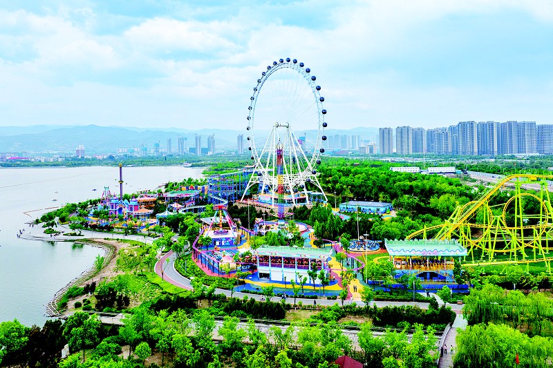 5月11日,山西省太原市,晋阳湖欢乐谷一座座大型游乐设施耸立在晋阳湖畔。据了解,欢乐谷园区内一处高88米的摩天轮成为地标性建筑,有着被广大游客称为“晋阳湖之眼”的美誉,吸引着海内外宾客。