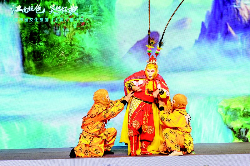 国家级非物质文化遗产、戏曲瑰宝——绍剧猴戏《美猴王》的表演拉开了推介会的序幕。来自绍兴的绍剧是浙江非遗中极具代表性的符号,“南派猴戏”的表演体系更被誉为戏曲界的“巅峰”;来自黄山市的徽剧经典选段 《百花赠剑》也登上舞台,以百转千回的唱腔、余音绕梁的旋律,为现场观众奉上了视听盛宴。杭州都市圈文旅特邀推介官朱小杰向现场观众展示了都市圈从文明溯源到自然奇观,从笔墨丹青到传统工艺的丰沛特色研学资源。