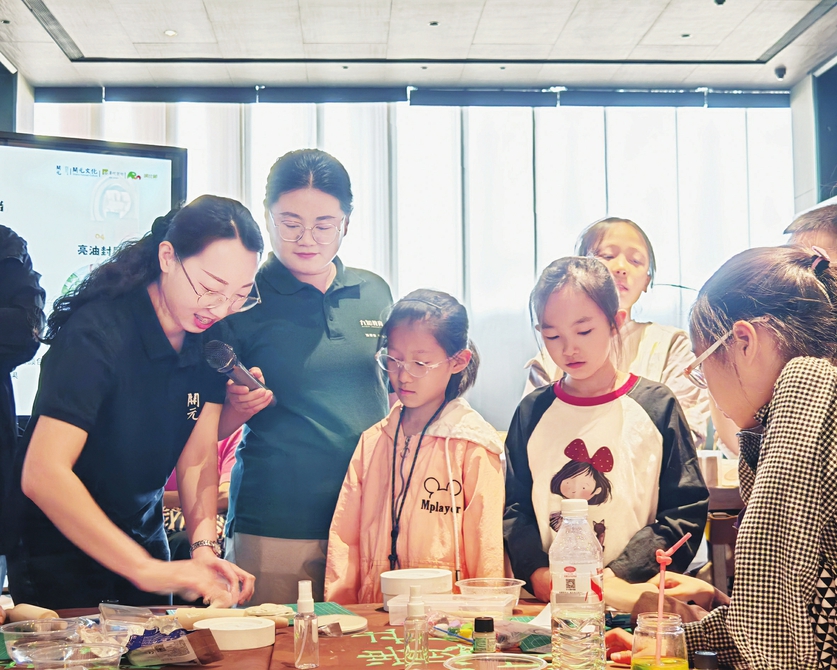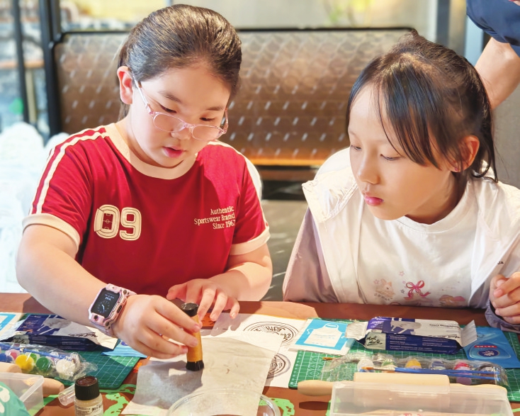 理论讲解后,备受期待的非遗体验环节开启。在专业老师指导下,孩子们化身小小工匠,拓包起落,墨色晕染,拓印纹样逐渐清晰;揉泥、制作、雕刻、上色,原本普通的素泥坯在孩子们手中蜕变为精美的仿琉璃瓦当。大家沉浸其中,真切感受传统工艺的精妙,实现了从“听文化”到“触摸文化”“体验文化”的转变。